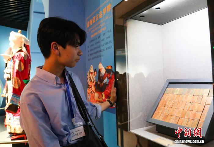 蒙古(モンゴル)族の達羅木牌を見学する創価大学の学生(撮影・馬銘言)。