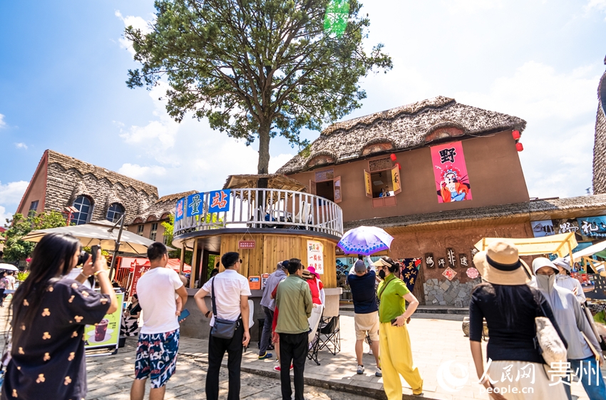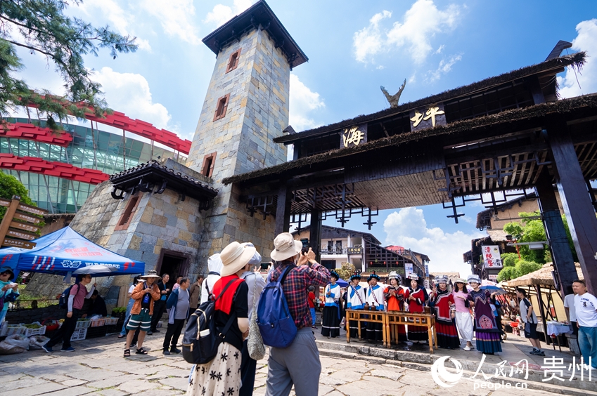 海坪彝族の特色ある観光リゾートタウンでパフォーマンスを見る観光客たち(撮影・涂敏)。