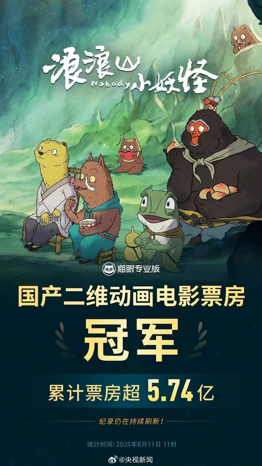今月2日に封切られた中国国産アニメ「浪浪山小妖怪(Nobody)」の興行収入が11日午前11時時点で、5億7400万元(1元は約20.6円)に達し、「大魚海棠(紅き大魚の伝説)」の5億7300万元を超えて、中国国産2Dアニメーション映画としては歴代トップに立った。