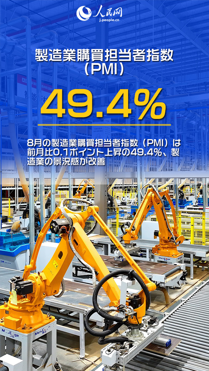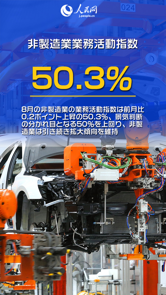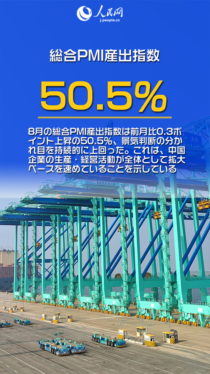 国家統計局サービス業調査センターと中国物流・購買連合会が8月31日に発表したデータによると、8月の製造業購買担当者指数(PMI)は前月比0.1ポイント上昇の49.4%で、製造業の景況感が改善した。非製造業の業務活動指数は前月比0.2ポイント上昇の50.3%となり、景気判断の分かれ目となる50%を上回り、非製造業は引き続き拡大傾向を維持した。また、総合PMI産出指数は前月比0.3ポイント上昇の50.5%で、景気判断の分かれ目を持続的に上回った。これは、中国企業の生産・経営活動が全体として拡大ペースを速めていることを示している。