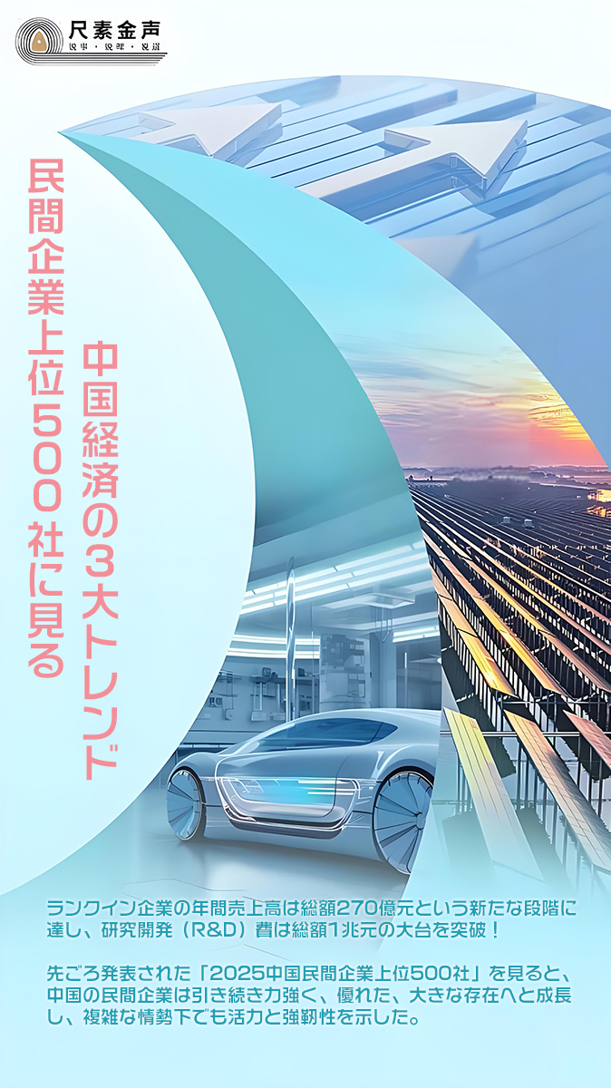 ランクイン企業の年間売上高は総額270億元(1元は約20.7円)という新たな段階に達し、研究開発(R&D)費は総額1兆元の大台を突破!先ごろ発表された「2025中国民間企業上位500社」を見ると、中国の民間企業は引き続き力強く、優れた、大きな存在へと成長し、複雑な情勢下でも活力と強靭性を示した。