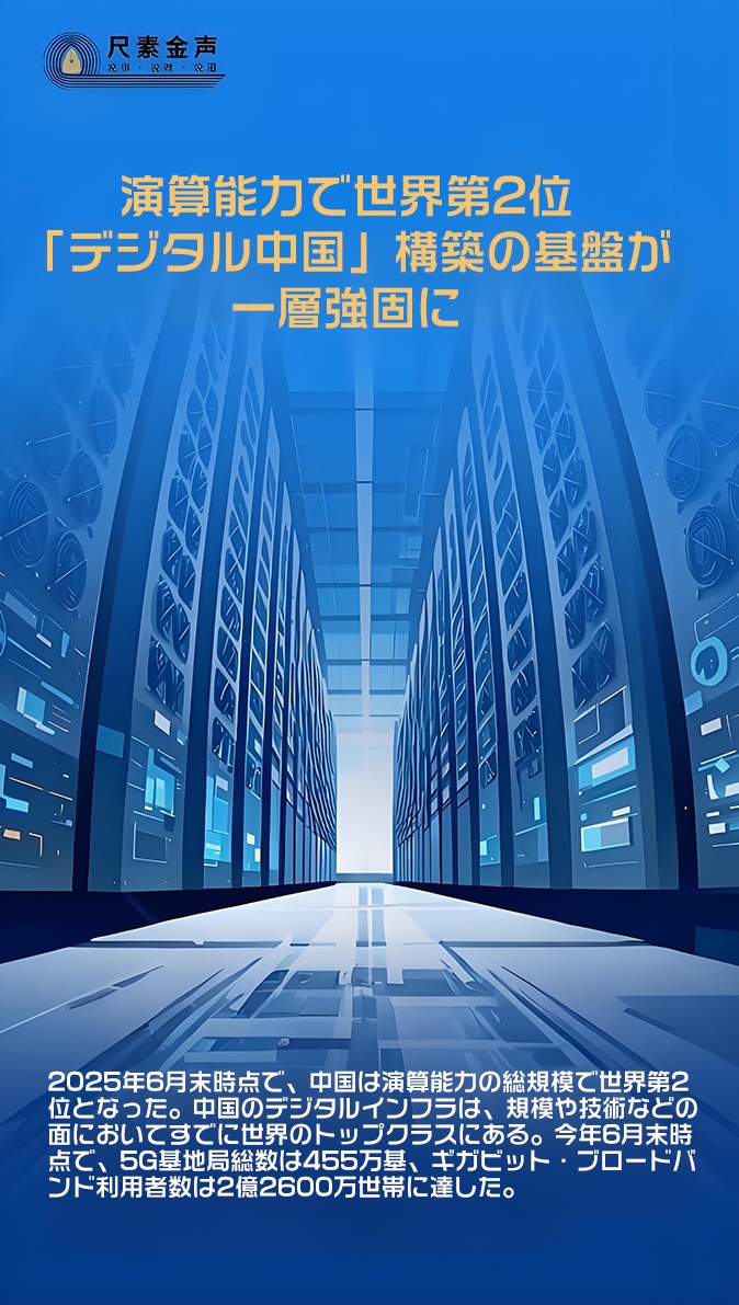 国家データ局の先ごろの発表によれば、2025年6月末時点で、中国は演算能力の総規模で世界第2位となった。中国のデジタルインフラは、規模や技術などの面においてすでに世界のトップクラスにある。今年6月末時点で、5G基地局総数は455万基、ギガビット・ブロードバンド利用者数は2億2600万世帯に達した。