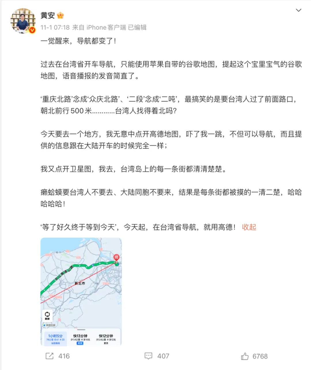 黄安は、「これまで、台湾で車を運転する時は、アップルのスマホについているグーグルマップしか使えなかった。でも、音声は発音が悪く、『重慶北路』を『衆慶北路』と言ったり、『二段』を『二吨』と言ったりする」と投稿。