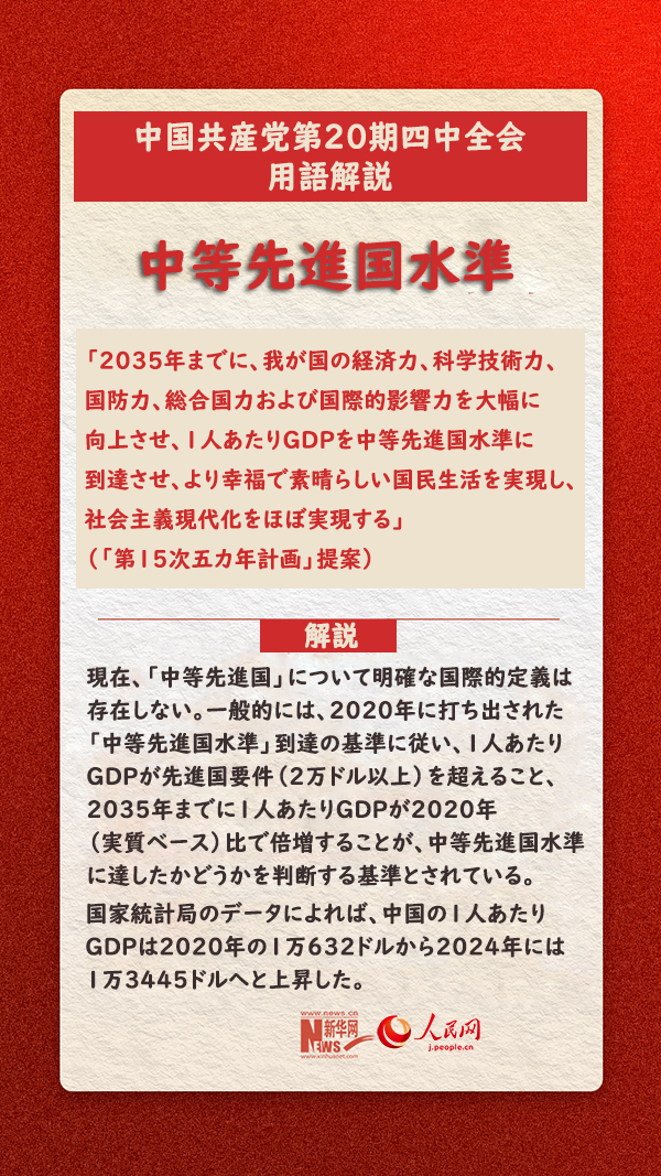 「2035年までに、我が国の経済力、科学技術力、国防力、総合国力および国際的影響力を大幅に向上させ、1人あたりGDPを中等先進国水準に到達させ、より幸福で素晴らしい国民生活を実現し、社会主義現代化をほぼ実現する」