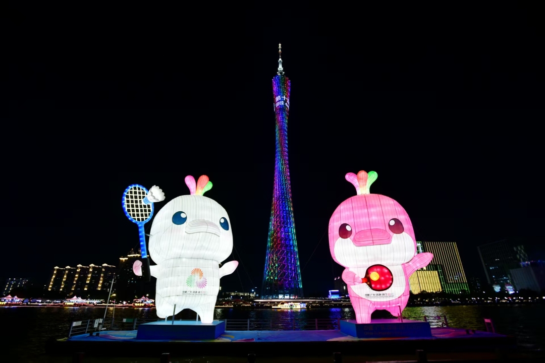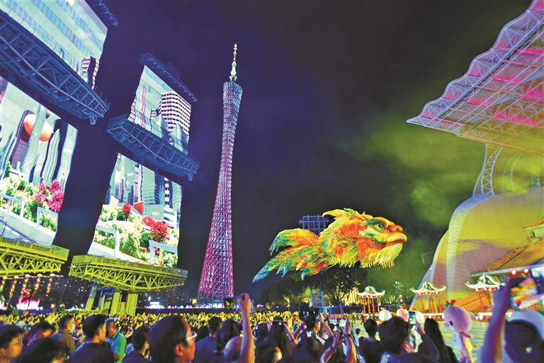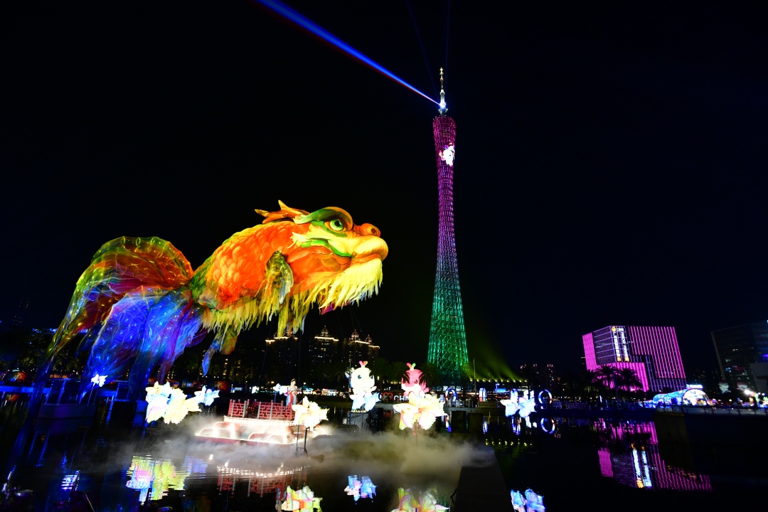 全運会の開会式で出現し、ネット上の話題をさらった中国の神話に登場する霊獣「大鰲魚」が16日夜、ライトフェスティバルで再び姿を現した。金色に輝く「大鰲魚」がフェスティバルの点灯セレモニーに登場すると、来場者から大きな歓声が起こり、多くの人がスマホで「大鰲魚」を撮影していた。「大鰲魚」は今年のライトフェスティバルの常設作品で、今後は海心沙亜運公園の星光大道展示エリアで静的展示され、「大鰲魚」と広州タワーの「競演」で、広州ならではのロマンチックな雰囲気を楽しむことができる。