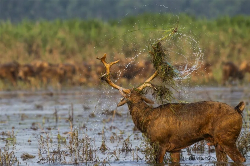 石首シフゾウ国家級自然保護区で、のんびりと過ごすシフゾウ(撮影・雷剛)。