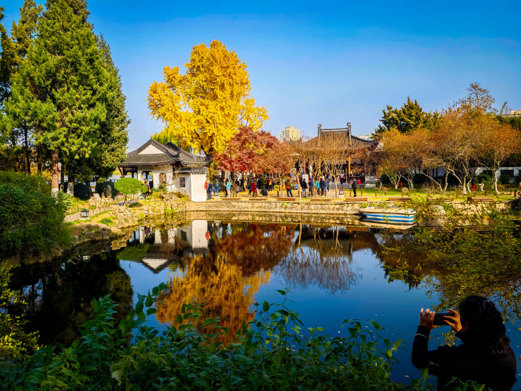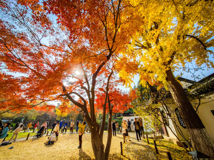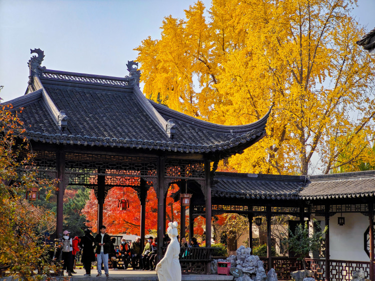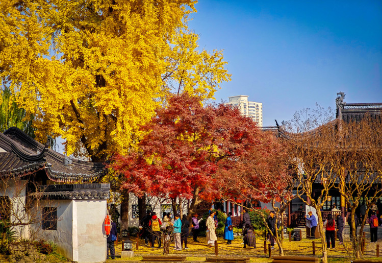 同公園には今、たくさんの市民や観光客が訪れて、楓とイチョウを同じフレームに収めることができる初冬限定の絶景を楽しんでいる。公園には灰色の瓦と白い壁が特徴の建物も並んでおり、歩くごとに景色が変わり、江南エリアならではの詩趣に富む情緒を堪能することができる。(編集KN)