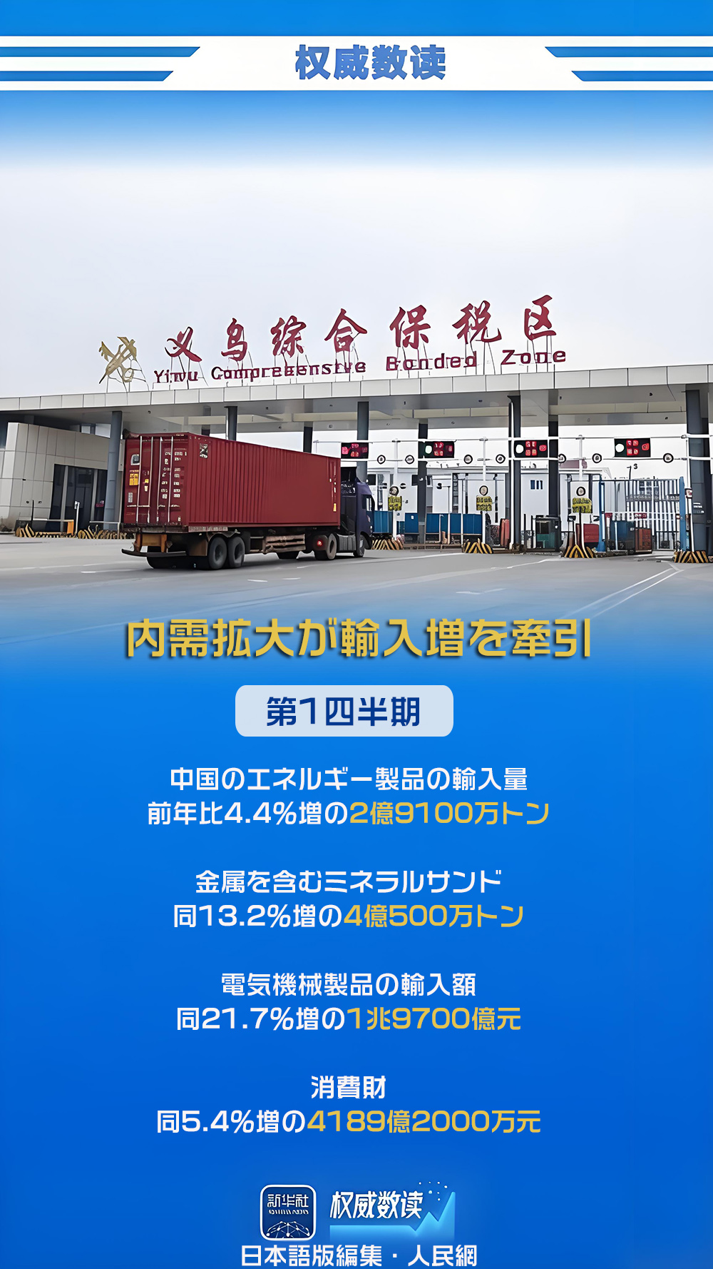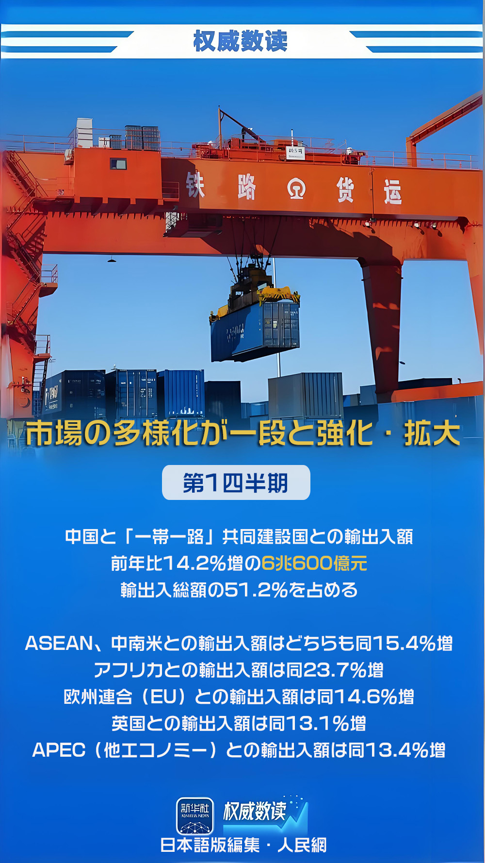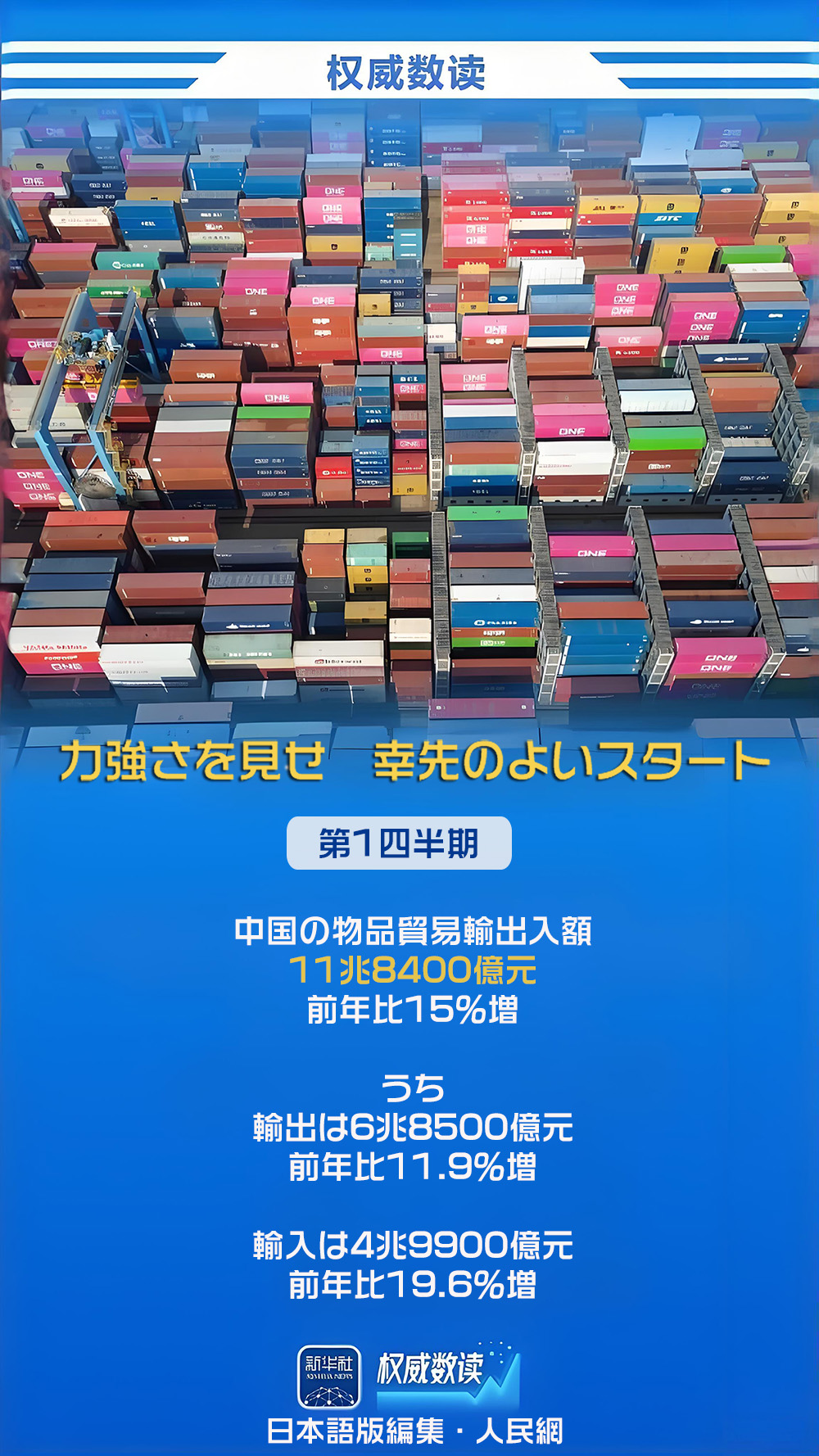 国務院新聞弁公室は14日に記者会見を行い、2026年第1四半期(1-3月)の輸出入の状況を説明した。同期の物品貿易の輸出入額は前年同期比15%増の11兆8400億元(1元は約23.3円)に達し、そのうち輸出は同11.9%増の6兆8500億元、輸入は同19.6%増の4兆9900億元だった。