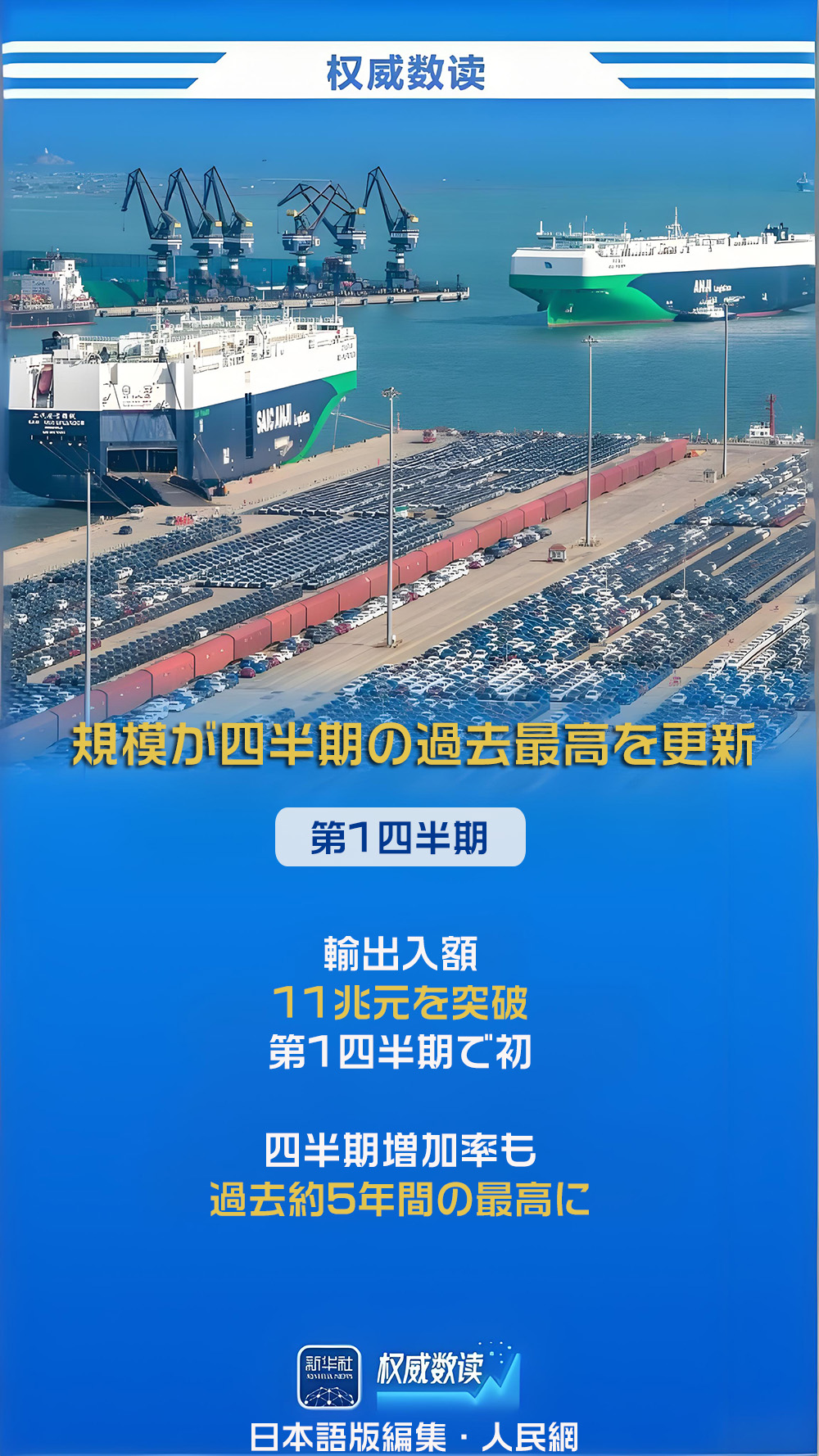 税関総署の王軍副署長は記者会見の中で、「年初以来、外部情勢が複雑さを増し、目まぐるしく変化する中で、中国の貿易は力強い動きを見せ、幸先のよいスタートを切った。第1四半期の輸出入額は同期として初めて11兆元を超え、四半期の増加率としても過去約5年間で最高だった」と説明した。