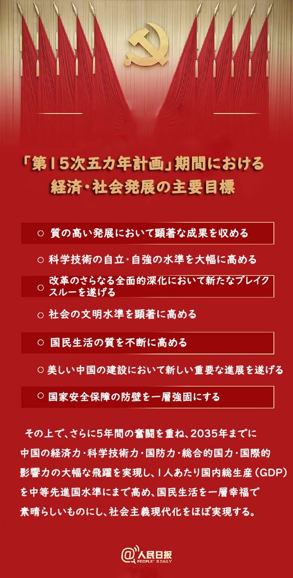 会議は「第15次五カ年計画」期間における経済・社会発展の主要目標として「質の高い発展において顕著な成果を収め、科学技術の自立・自強の水準を大幅に高め、改革のさらなる全面的深化において新たなブレイクスルーを遂げ、社会の文明水準を顕著に高め、国民生活の質を不断に高め、美しい中国の建設において新しい重要な進展を遂げ、国家安全保障の防壁を一層強固にする」ことを掲げた。