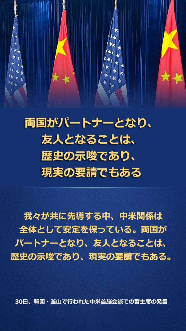 「我々が共に先導する中、中米関係は全体として安定を保っている。両国がパートナーとなり、友人となることは、歴史の示唆であり、現実の要請でもある」